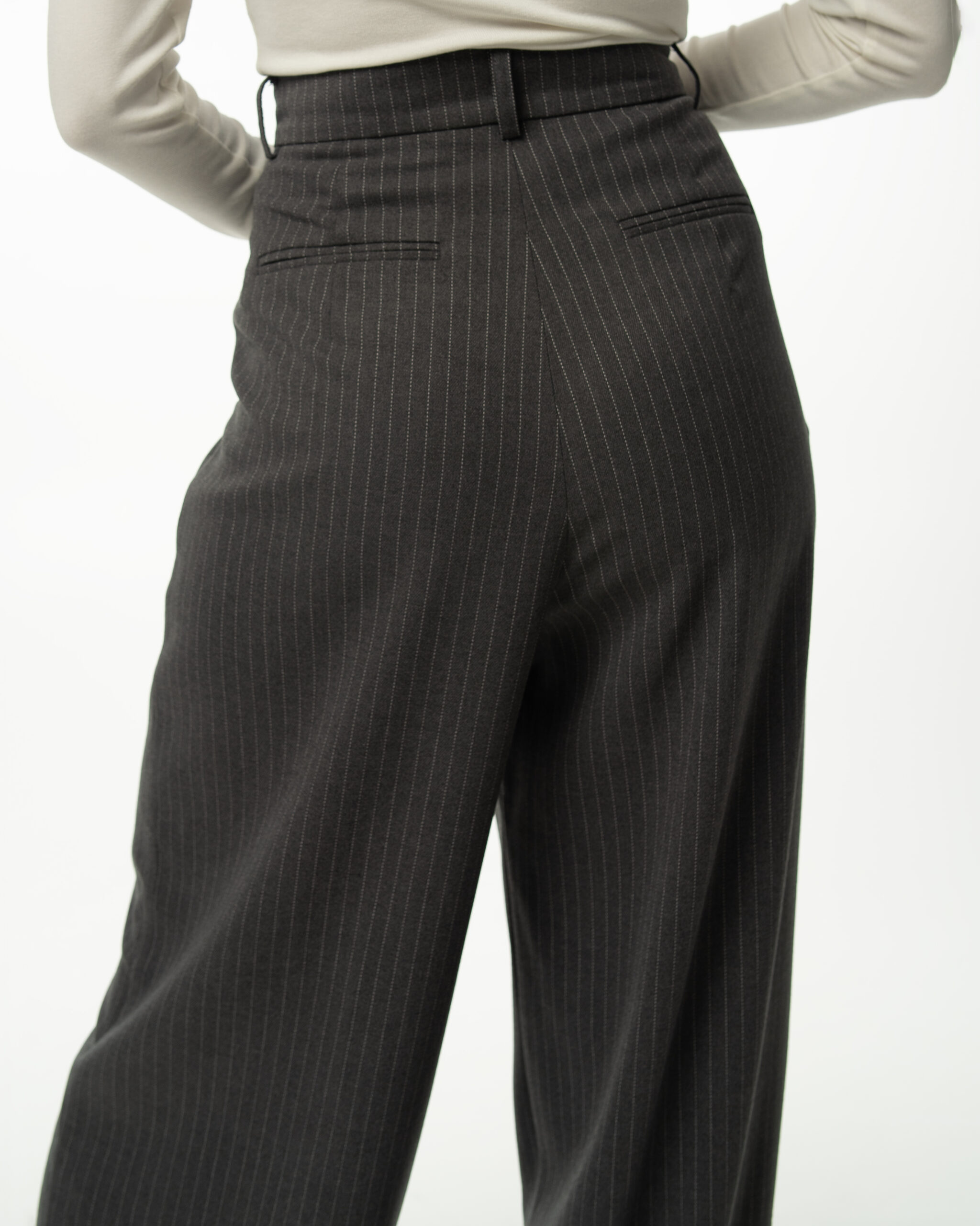 Materiał miękko układa się na ciele i zapewnia swobodę ruchów przez cały dzień. Ponadto cienkie pionowe paski wysmuklają sylwetkę i dodają całości eleganckiego charakteru. Spodnie doskonale sprawdzą się w pracy, podczas spotkań biznesowych oraz na co dzień. W rezultacie możesz z łatwością dopasować je do różnych stylizacji.