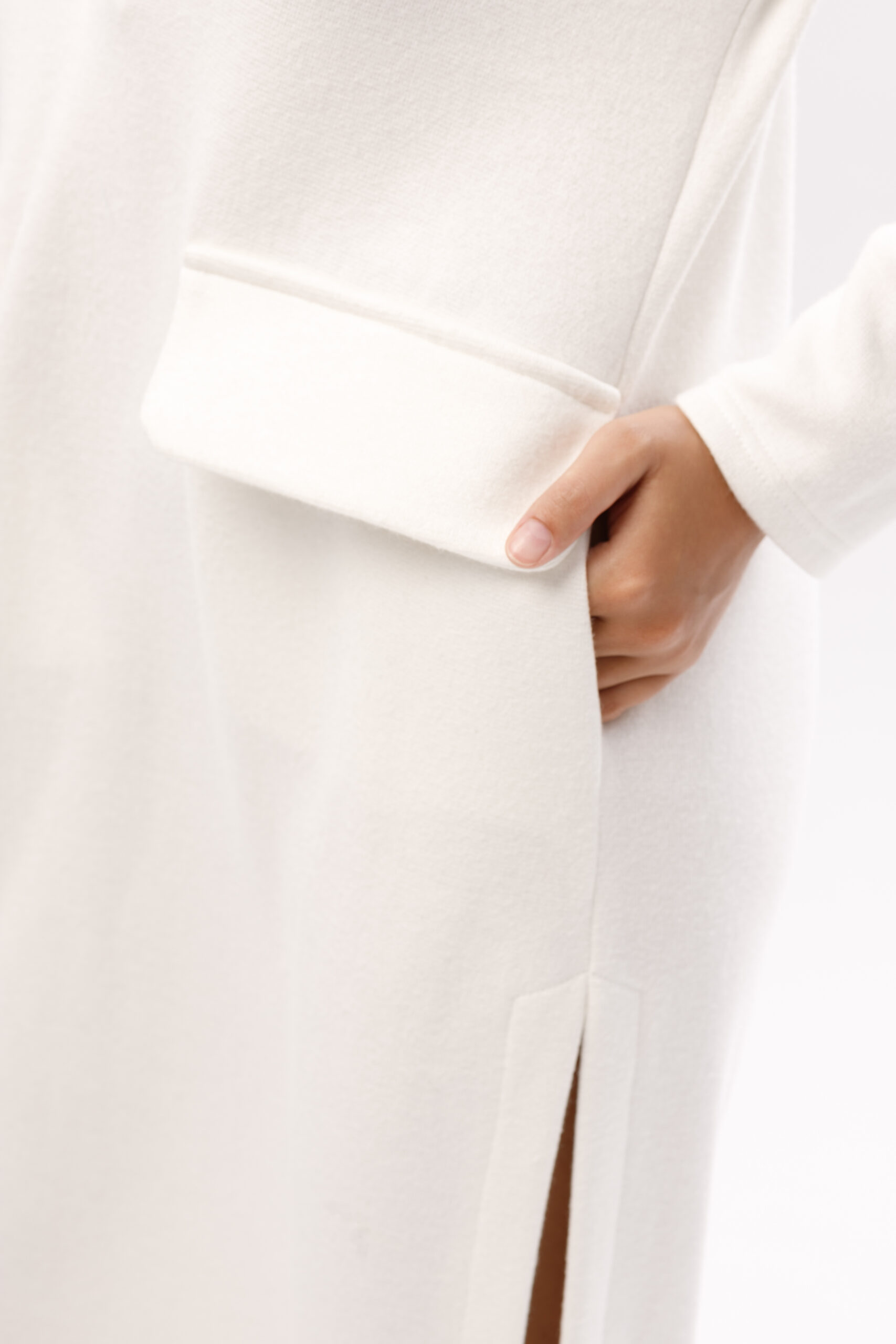 Praktyczne kieszenie ukryte są w bocznych szwach, co pozwala zachować czystą linię fasonu. Wysoki rozporek nadaje sukience lekkości i kobiecej zmysłowości, jednocześnie zapewniając swobodę ruchów.